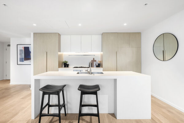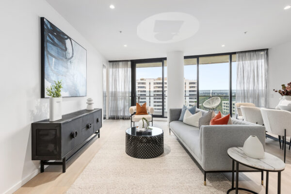 Set high on the 11th floor, the home reveals an expansive open-plan living and dining domain, framed by floor-to-ceiling glass and extending seamlessly to a stunning curved balcony. From here, enjoy sweeping views across the tree-lined boulevard, creating the perfect setting for both relaxed living and effortless entertaining.