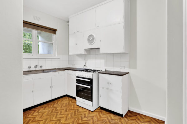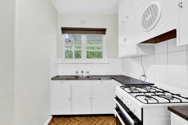 The kitchen has been thoughtfully refreshed with new finishes, including updated cabinetry and flooring, complementing the apartment’s fresh paintwork and brand-new carpet throughout, creating a clean and inviting interior.